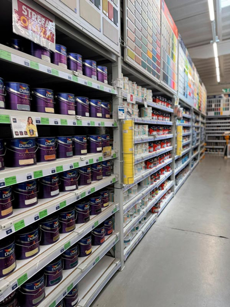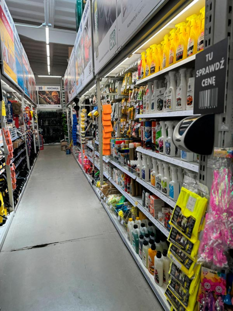 Klienci znajdą tu wszystko, czego potrzebują do budowy, remontu i wyposażenia domu oraz ogrodu – od narzędzi, materiałów budowlanych i hydraulicznych, przez farby, chemię budowlaną, aż po dekoracje, oświetlenie i artykuły sezonowe. Market wyróżnia się nowoczesnym wnętrzem, przejrzystym układem działów i regularnymi promocjami.